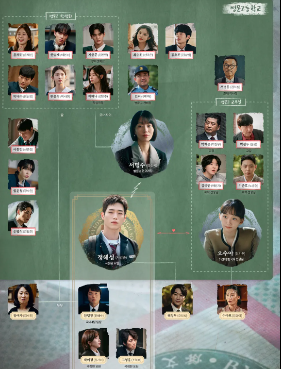 인물관계도: 정해성은 국정원 요원으로서 학생으로 위장 잠입하고, 오수아와의 과거 인연 암시, 교감 김도진과 교장 박철민이 학교 권력을 형성. 학생 이수민·한지훈은 해성의 학교 생활에 중요한 역할. 이런 관계 속에서 이야기가 전개됩니다.