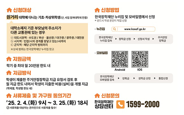 청년 주거안정장학금은 원거리 대학에 진학하여 주거비 부담이 큰 저소득층 대학생들의 경제적 어려움을 덜어주기 위해 2025년부터 새롭게 도입된 제도입니다. 장학금은 학기 중 월 최대 20만 원을 지원하여 학생들이 학업에 전념할 수 있도록 돕습니다.