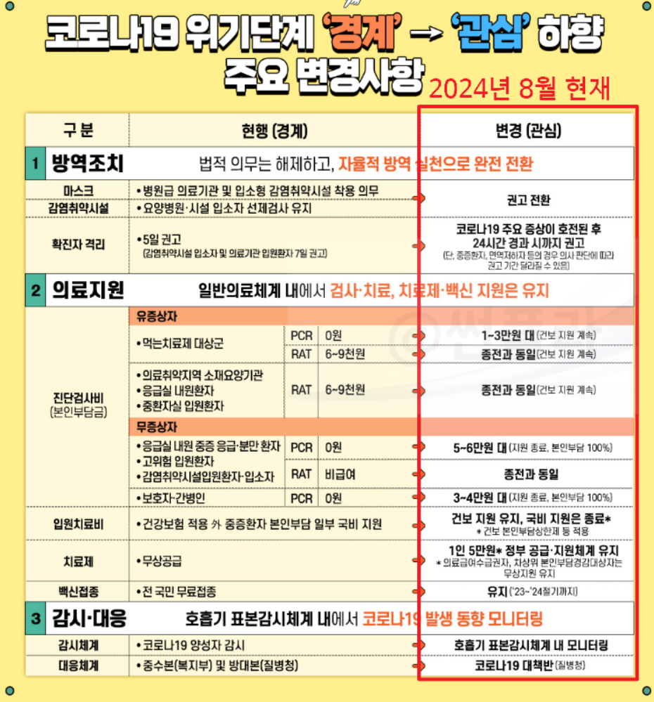 2024년 8월부터 대한민국의 코로나19 위기 단계가 '경계'에서 '관심'으로 하향 조정되었습니다. 이에 따른 주요 방역 조치 및 격리 지침의 변경 사항을 아래와 같이 안내드립니다.